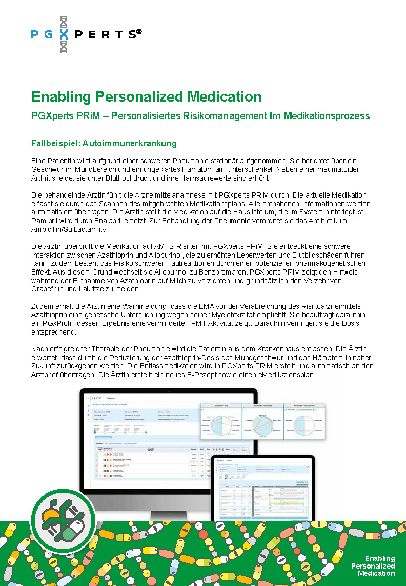 Dr. Müller wird darüber informiert, dass die FDA vor der Verabreichung des Risikoarzneimittels Azathioprin eine genetische Untersuchung wegen seiner Myelotoxizität empfiehlt. Sie beauftragt daraufhin eine Genotypisierung, deren Ergebnis eine verminderte TPMT-Aktivität zeigt. Daraufhin verringert Dr. Müller die Dosis entsprechend.